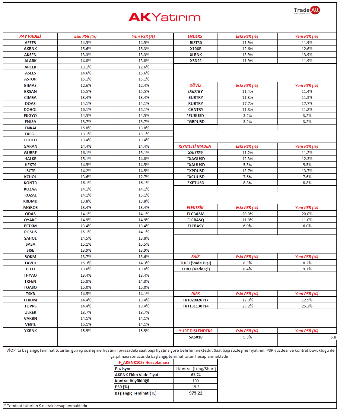 VİOP Span parametreleri 01.10.2025 Çarşamba günü, gün içi ilk risk hesaplama anından itibaren geçerli olacak şekilde güncellenecektir. Güncel parametreler aşağıdaki tabloda yer almaktadır. İlgili Takasbank duyurusu için tıklayınız.