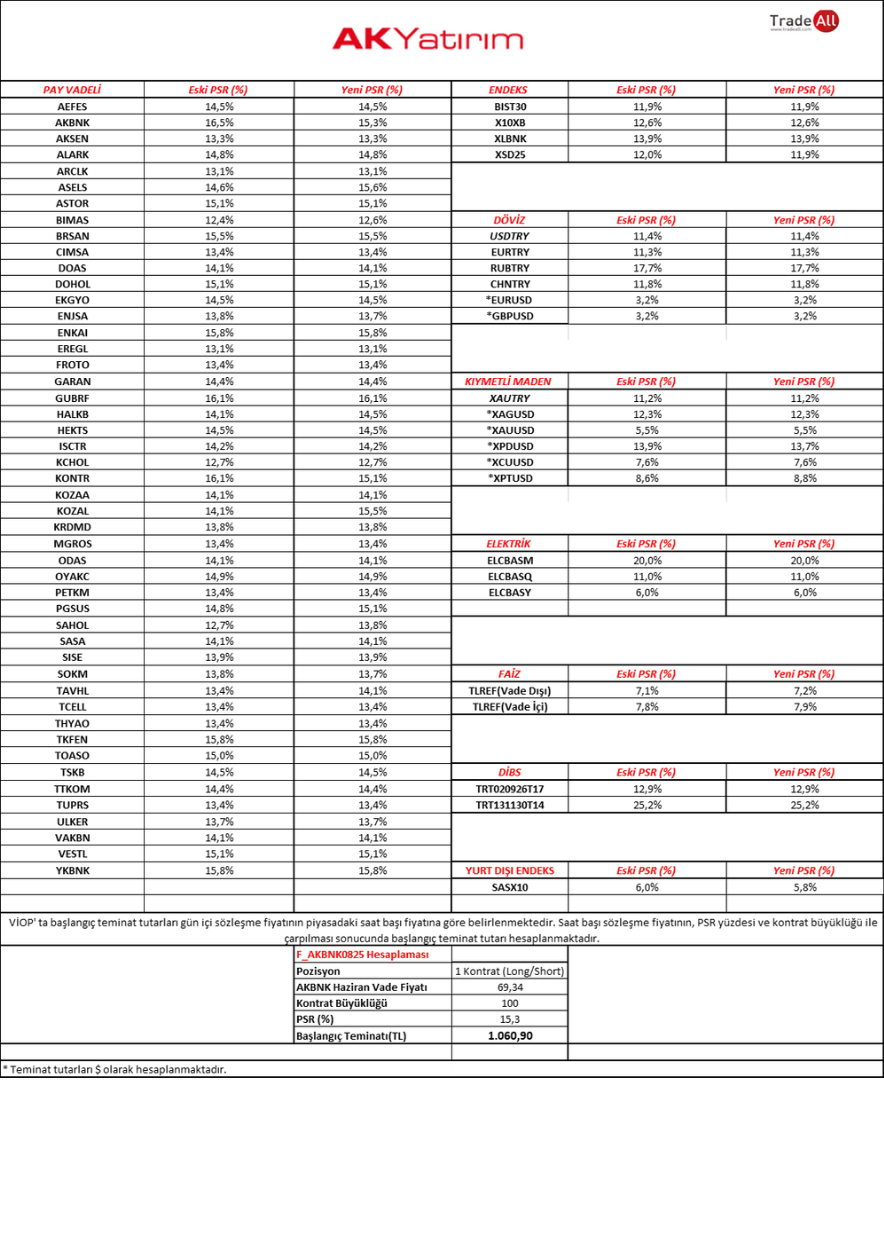 VİOP Span parametreleri 01.08.2025 Cuma günü, gün içi ilk risk hesaplama anından itibaren geçerli olacak şekilde güncellenecektir. Güncel parametreler aşağıdaki tabloda yer almaktadır. İlgili Takasbank duyurusu için tıklayınız.