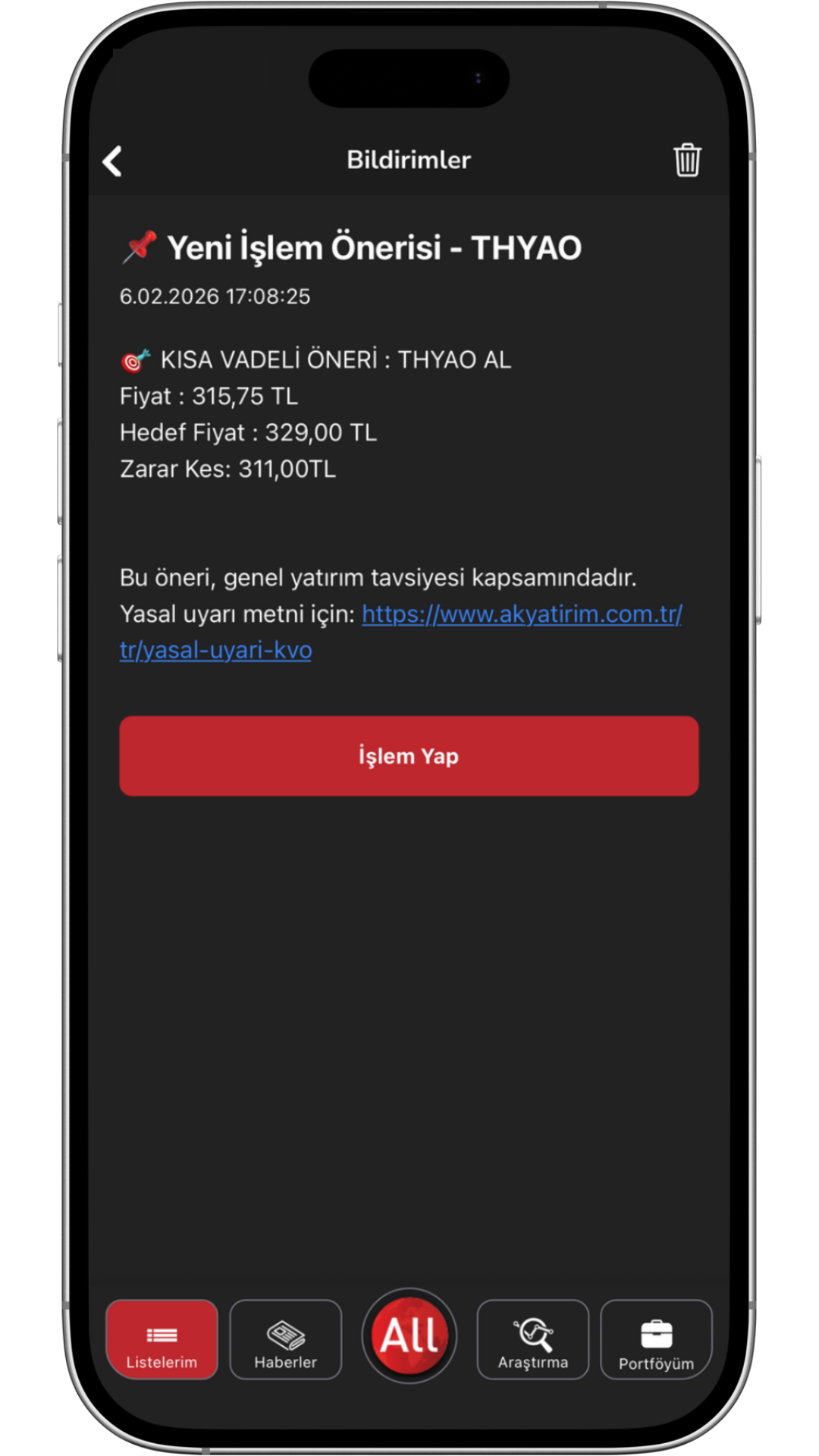 Günlük İşlem Önerileri: Ak Yatırım Araştırma ekibinin günlük hisse senedi alım – satım önerileri, hedef fiyat ve zarar kes seviyeleriyle sizinle. Anlık bildirimlerde günlük işlem önerilerini görebilir, yatırım fırsatlarını değerlendirebilirsiniz.