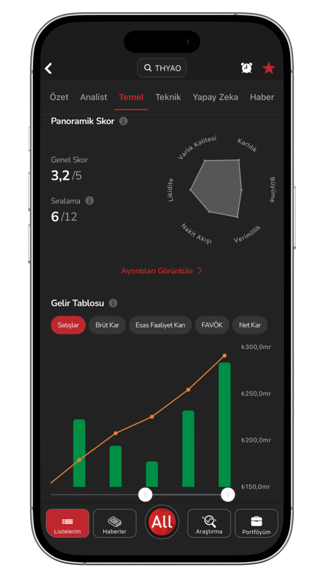 Temel Analiz: Şirket verileri üzerinden tüm temel analiz akışını şematik ve görsel olarak sunar. Hissenin geçmiş hareketlerine göre yapay zeka tahmin projeksiyonu oluşturur. Siz de TradeAll TR ile şirket grafiklerine ulaşabilir, detaylı bir karşılaştırma yapabilirsiniz.