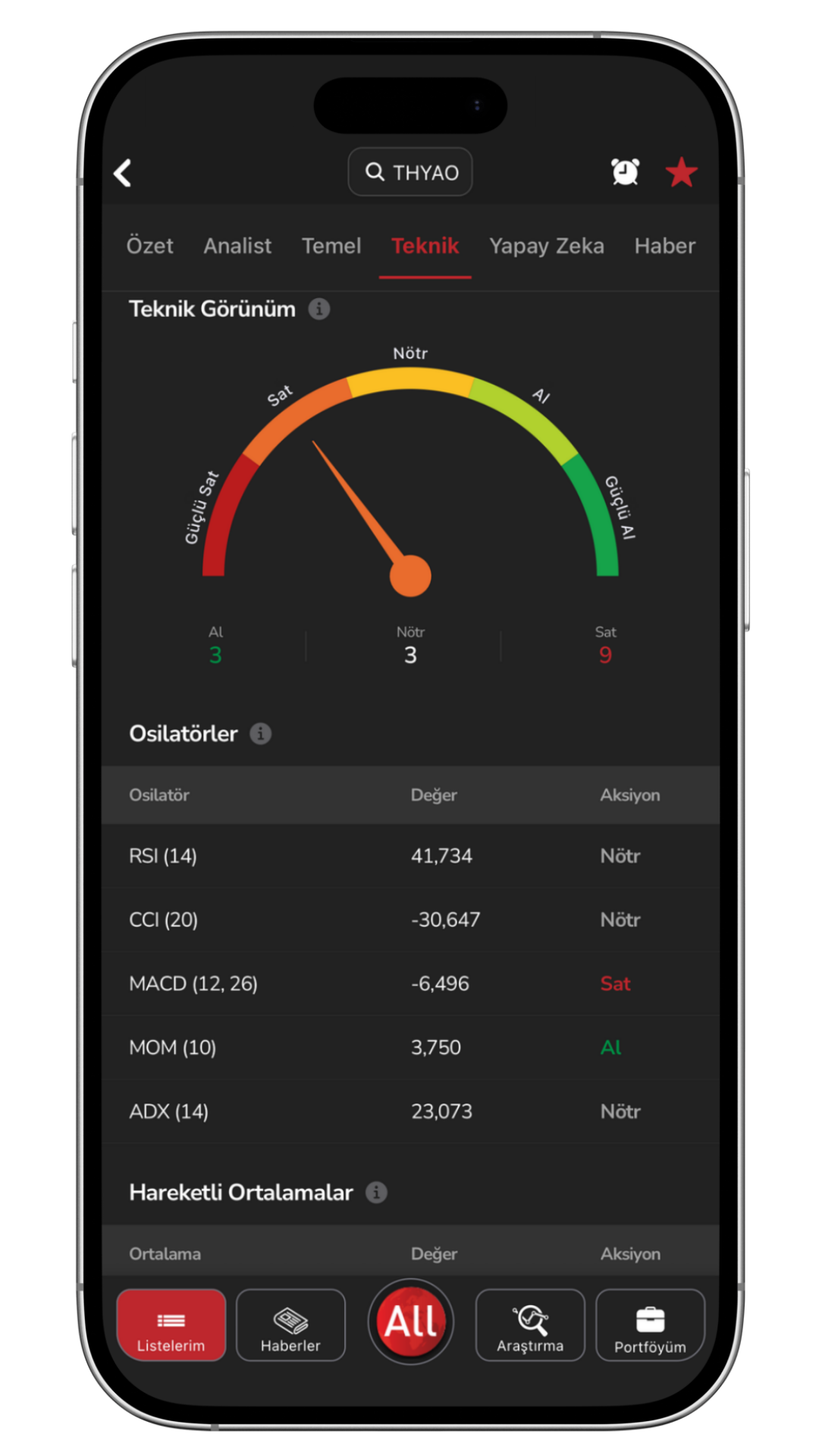 Teknik Analiz: Yapay zeka destekli projeksiyonu ile hisse senedi grafiklerini inceleyerek yükseliş ve düşüş eğilimlerini belirler. 15 hareketli ortalama ve osilatöre göre belirlenmiş al, sat, nötr sinyalleri görebilirsiniz.