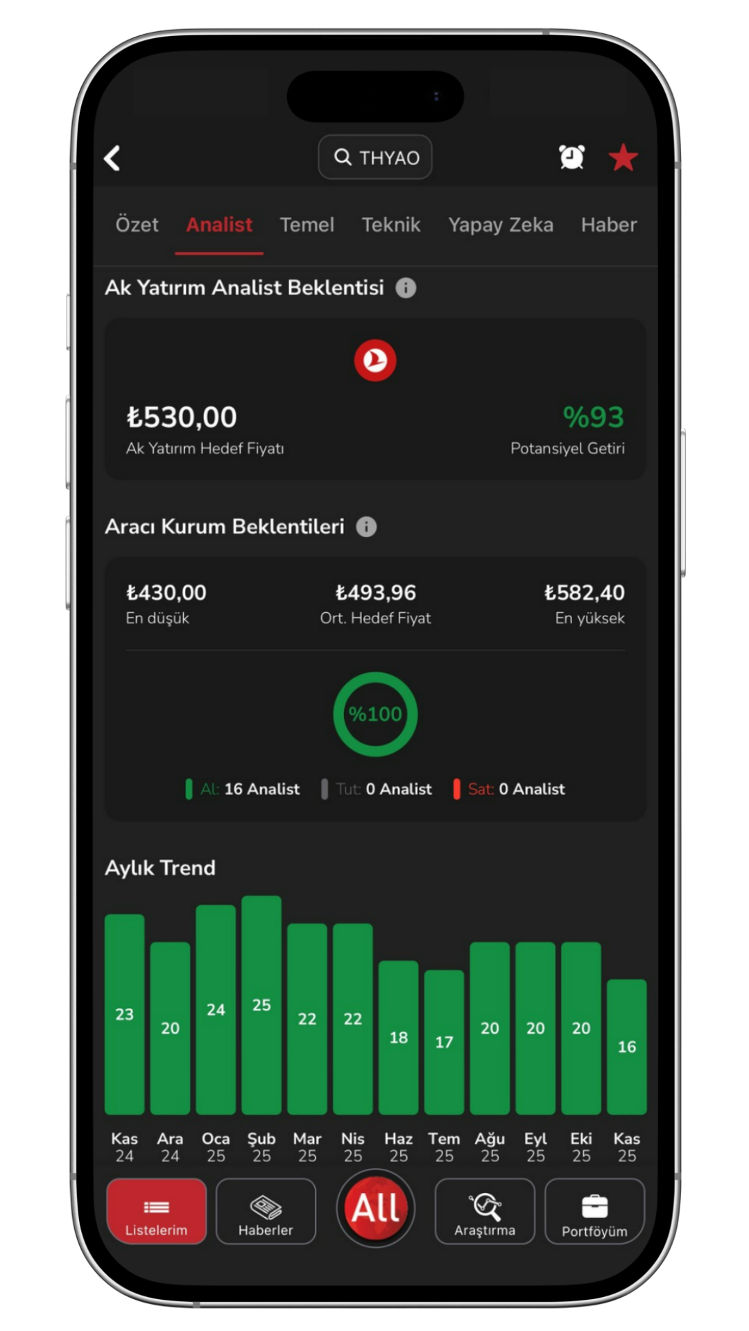 Analist: Ak Yatırım ve diğer kurumların yayınladığı araştırma raporlarını analist beklentileri ile sunar. Siz de seçtiğiniz hisse kartı içinde analist raporlarına, hedef fiyatlarına, al/sat/nötr sinyallerine kolayca ulaşabilirsiniz.